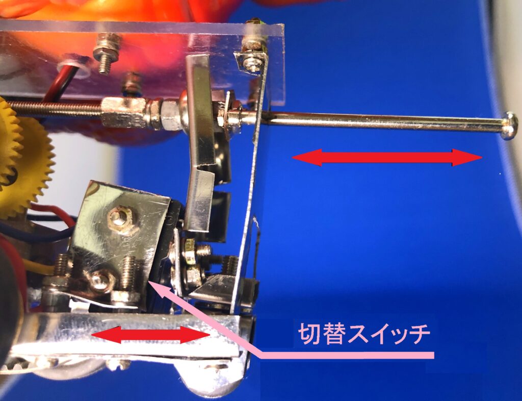 写真ー4:ロッドの水平移動により、逆転スイッチのONーOFFが切り替わる。動いたロッドは磁石によって水平位置が保持される(移動中の振動でスイッチがONでもOFFでもない状態に緩むのを避ける)。