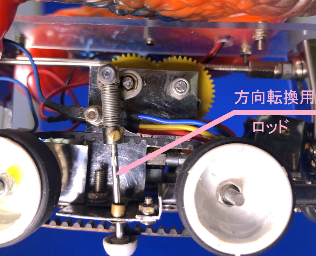 写真ー5:ユニバーサルギヤの上部に追加したクランクギヤにより、方向転換用ロッドが上下動する。