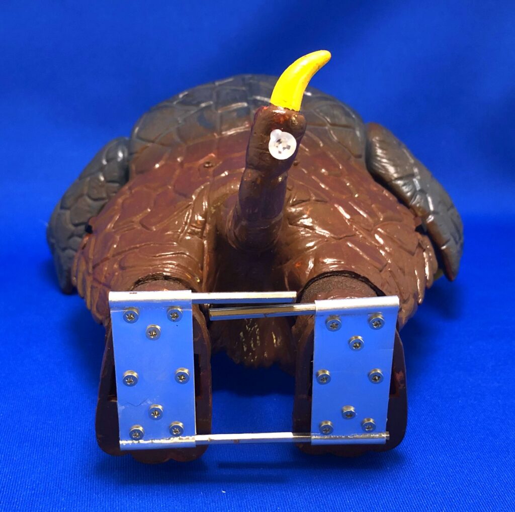 CCP佐竹雅昭コレクションのソフビを使用しました。廉価で非常によく出来たソフビなのですが、身体がスリムなので大掛かりな駆動装置を組み込めないことから、思い切ってタミヤ水中ギヤボックスセットによる水陸両用仕様としました。基本は真っすぐに前進するだけですが、水中モーターを使用しているのでお風呂でも遊ぶことができます。水面を泳ぐことを想定し、歩行車輪に水かき用の羽根をつけていますが、推力が弱く進みません。水面に浮かばせるためには内部に発泡スチロール等の浮き材が必要と考えられます。