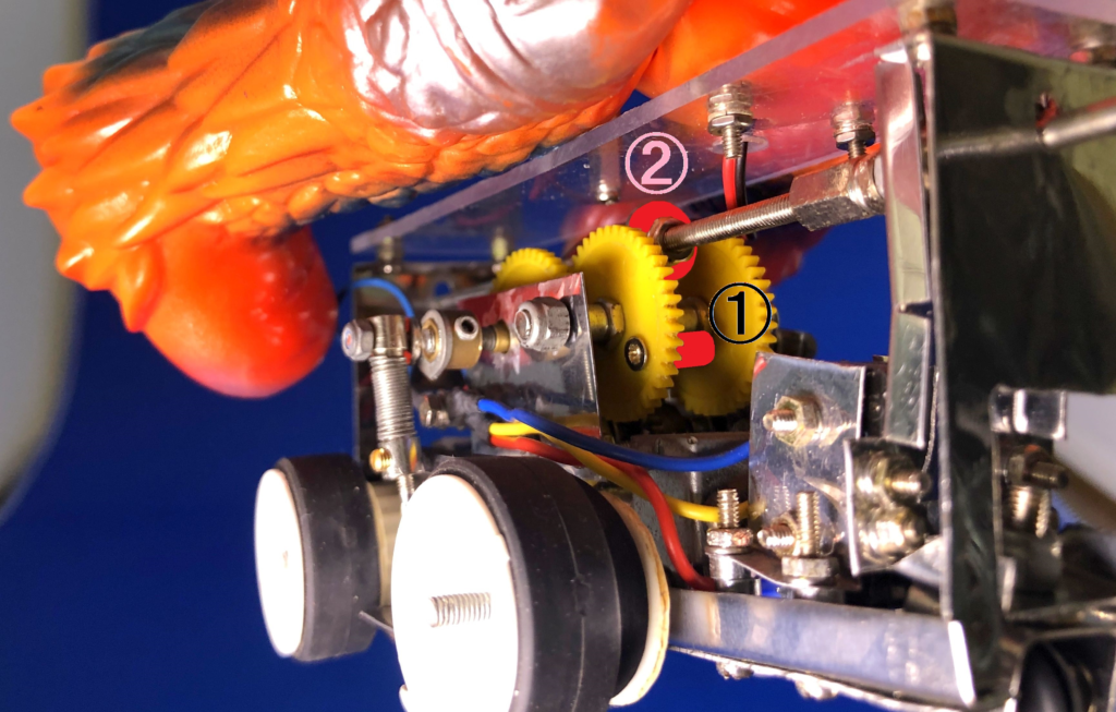 ムルチと言えば、あの悲しそうな鳴き声が特徴的です。ただ鳴かせるだけでは面白くないので、一定時間歩いた後、立ち止まって鳴き、それを繰り返すことにしました。一連の動きを機械的に制御するため、写真ー3に示す装置を自作しています。