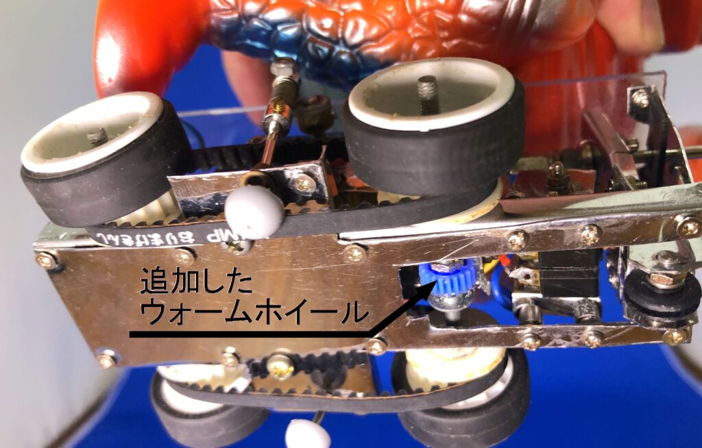 台車から水平方向に突き出ているロッドがスイッチを機械的に切り替えることで前後進を制御するため、各部品の取付位置の調整には苦労しました。また、方向転換用の鉛直方向ロッドを配置するため、ユニバーサルギヤの3mm出力シャフトを前方にスライドさせる必要があり、直交する2mm出力シャフトにウォームギヤをかぶせ、ドライブケースを前方にもうひとつ追加する処理を行っています。